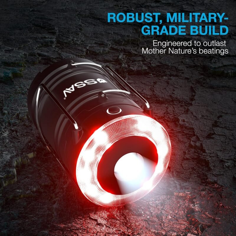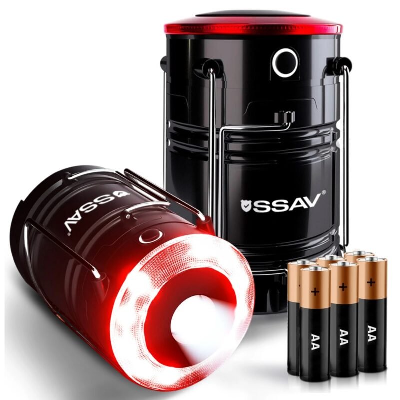 SSAV LED Camping Lantern with Red Safety Ring – 360° Light, IP44 Water Resistant (Black with Red Top, 2 Pack)